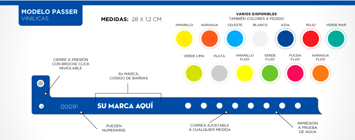 Las fabricamos a partir de un plástico flexible, durable, de gran tenacidad y casi imposible de romper por desgarro o tracción. No se enrulan, son económicas de excelente calidad. La medida estándar de nuestras pulseras Passer es de 1,2 cm de ancho y 28cm de largo. El cierre se logra meditan un broche que se inserta en uno de los orificios, adaptándose a la medida de la muñeca. el broche, una vez cerrado, no se puede abrir.